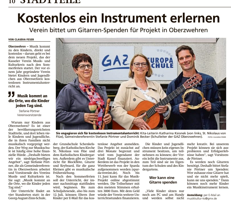 Der Verein ermöglicht Kindern im Stadtteil Oberzwehren, kostenlos ein Instrument zu lernen. Ca. 60 Kinder nehmen z.Zt. die Möglichkeit wahr an musikalischer Früherziehung, Gitarren- oder Keyboardunterricht teilzunehmen.