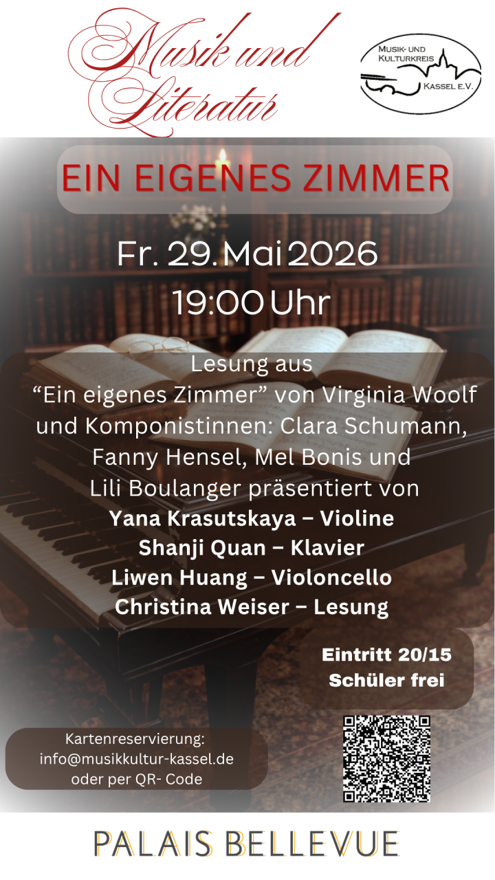 "Ein eigenes Zimmer" Ein außergewöhnlicher Konzertabend verbindet Literatur und Musik, der musikalische und literarische Stimmen miteinander verwebt und den Blick auf weibliche Kreativität richtet. Was wäre aus einer ebenso genialen Schwester von William Shakespeare geworden? Ausgehend von dieser berühmten Gedankenfigur eröffnet Virginia Woolf einen Perspektivwechsel, der bis heute nachwirkt. Lesung aus „Ein eigenes Zimmer“ von …